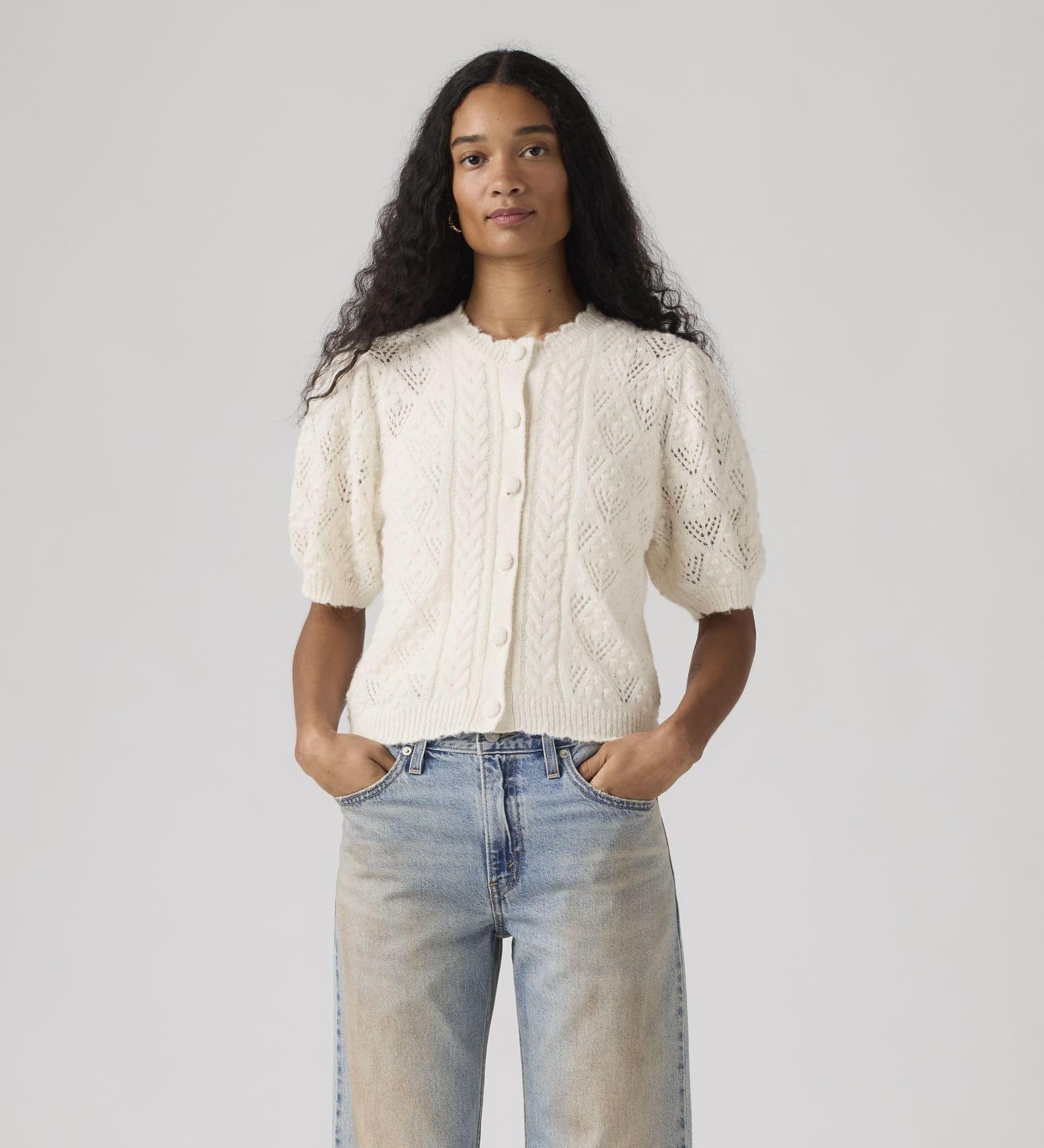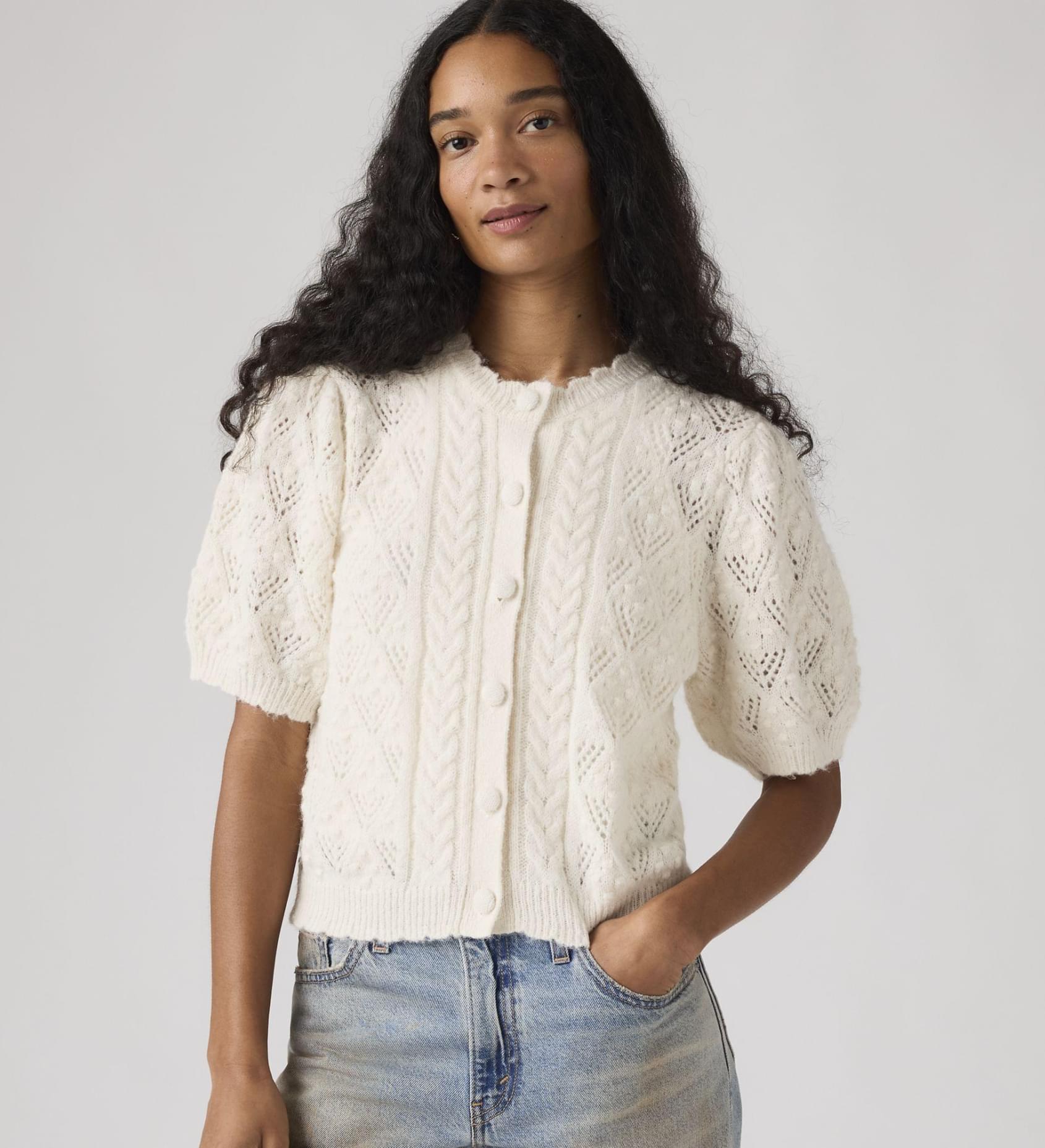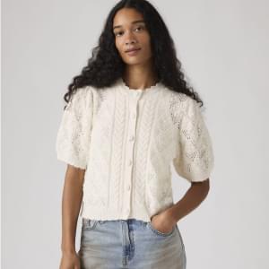 With its classic buttons, pretty crochet design and soft fabric, this Pauline Pointelle Short-Sleeve Cardigan is your sweetest top option for in-between weather.