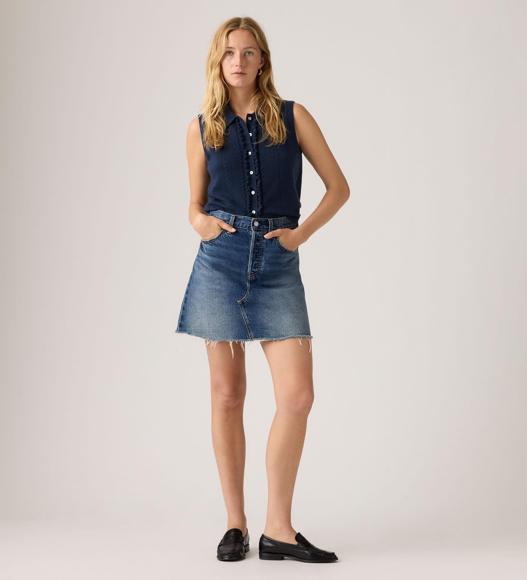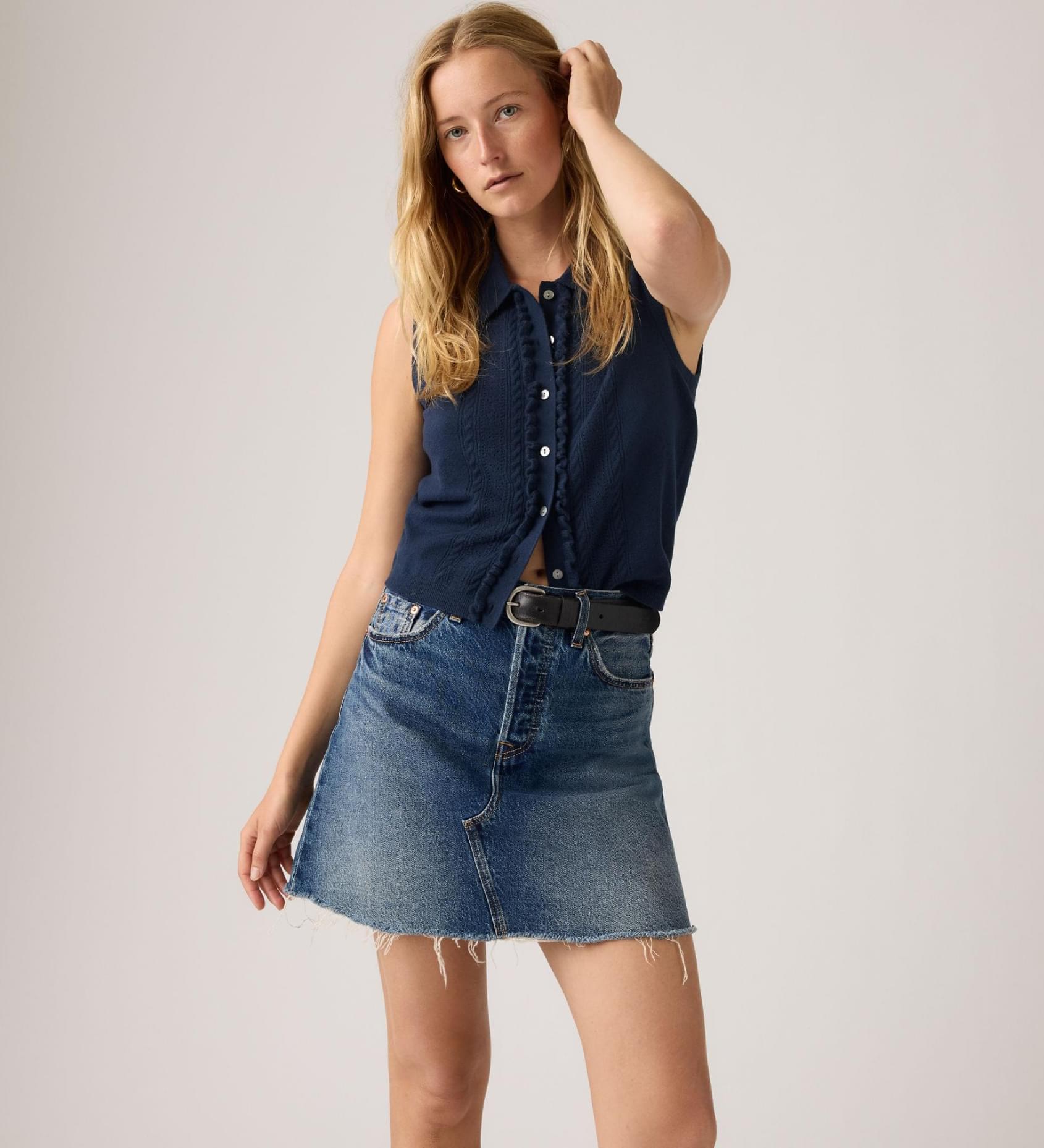 Proof that great things come in small packages. Our Deconstructed Skirt features a mid-thigh cut and a raw hem for extra character.
