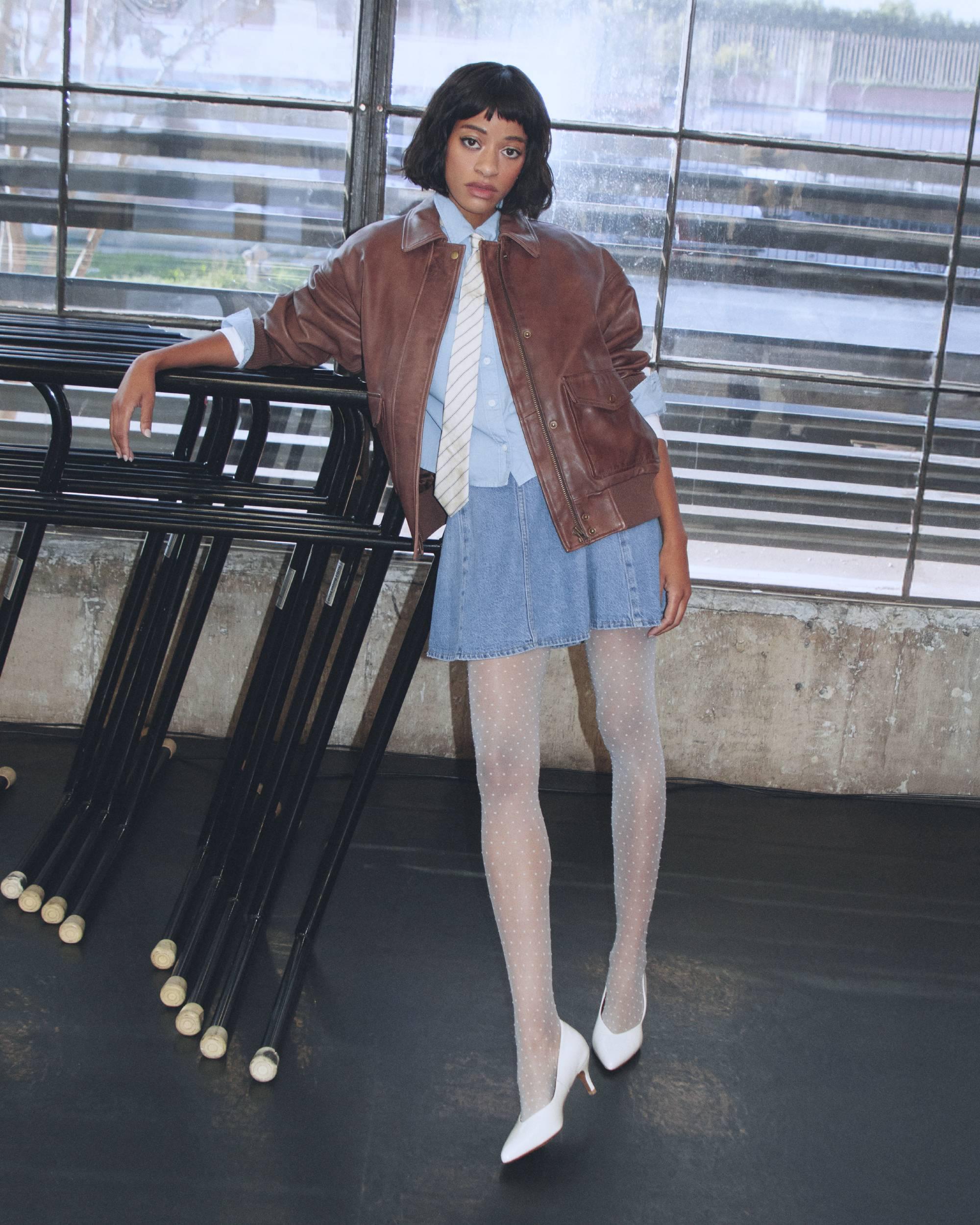 Saia de ganga. Bomber com um toque masculino. Camisa cropped. Uma ligação entre o masculino e o feminino.