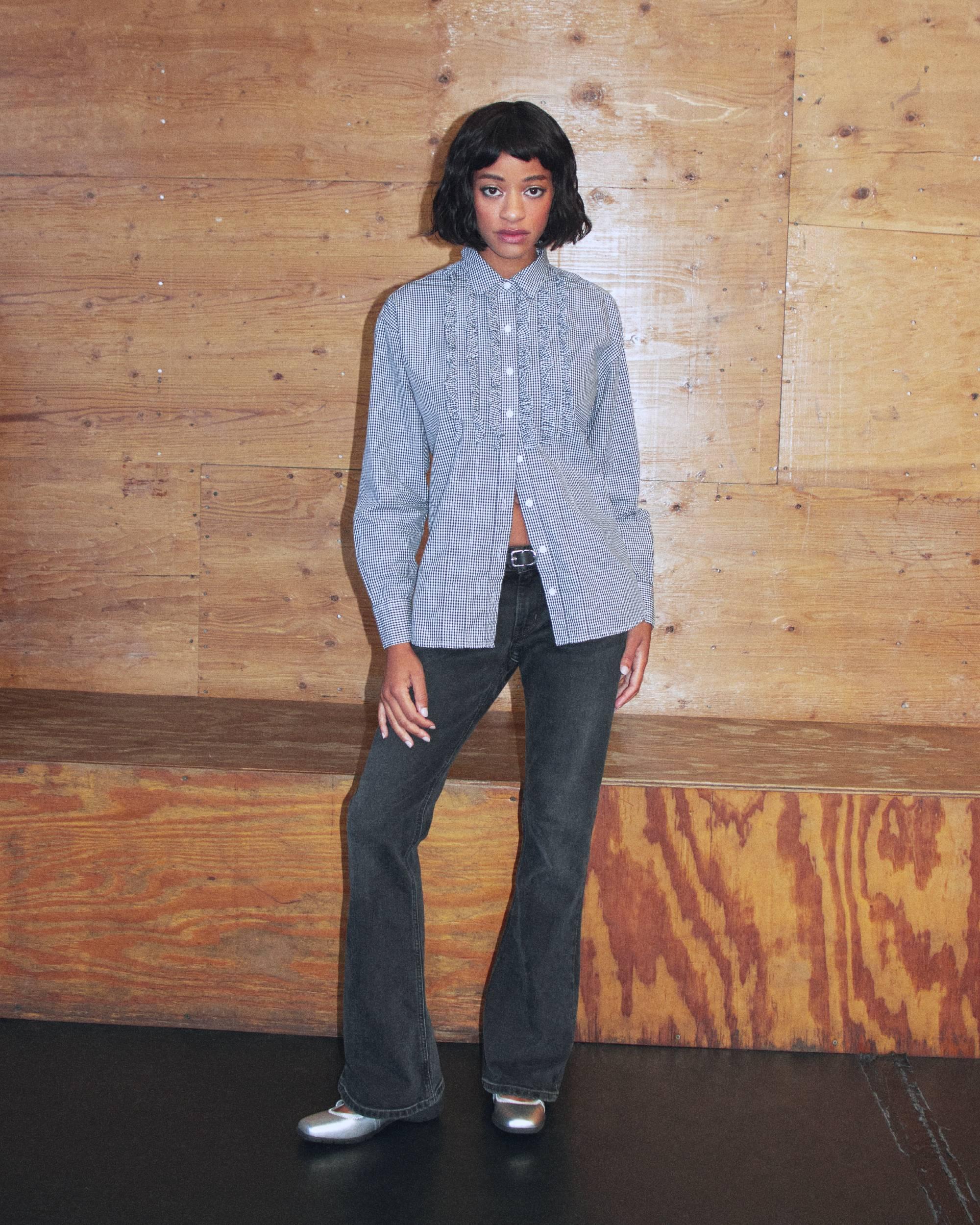 Padrão xadrez e jeans usados em conjunto.